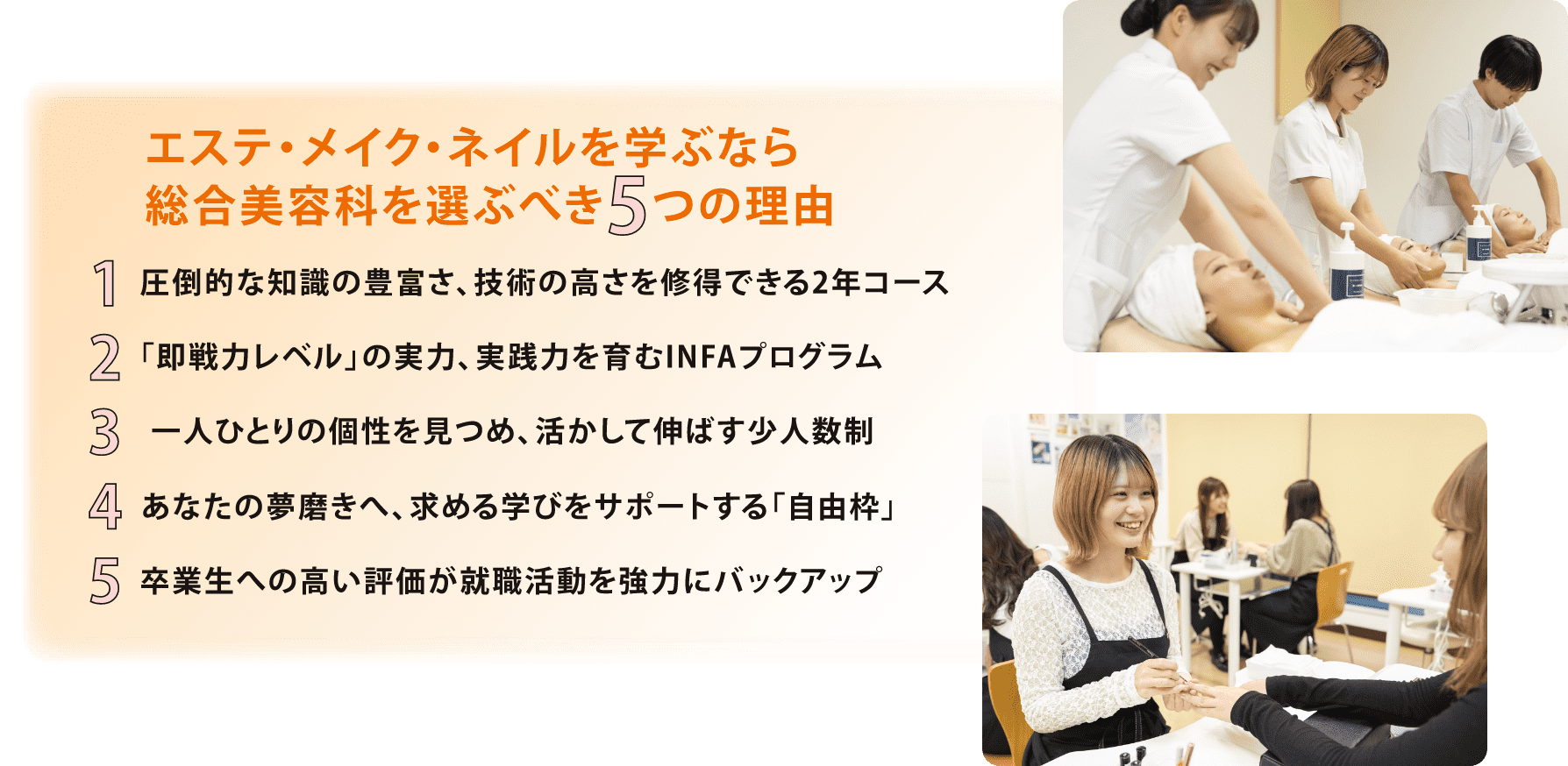 全身の「すっぴんの美しさ」を創る総合美容INFAプログラムを基本に、全ての基礎的な技術を学びます。専門以外の各分野の基本技術もしっかり習得し、「トータルビューティ」をサポートできる総合力を磨きます。この基礎は、専門分野での活動に厚みを与え、コースで選んだ以外の分野でも活躍できる可能性を広げます。